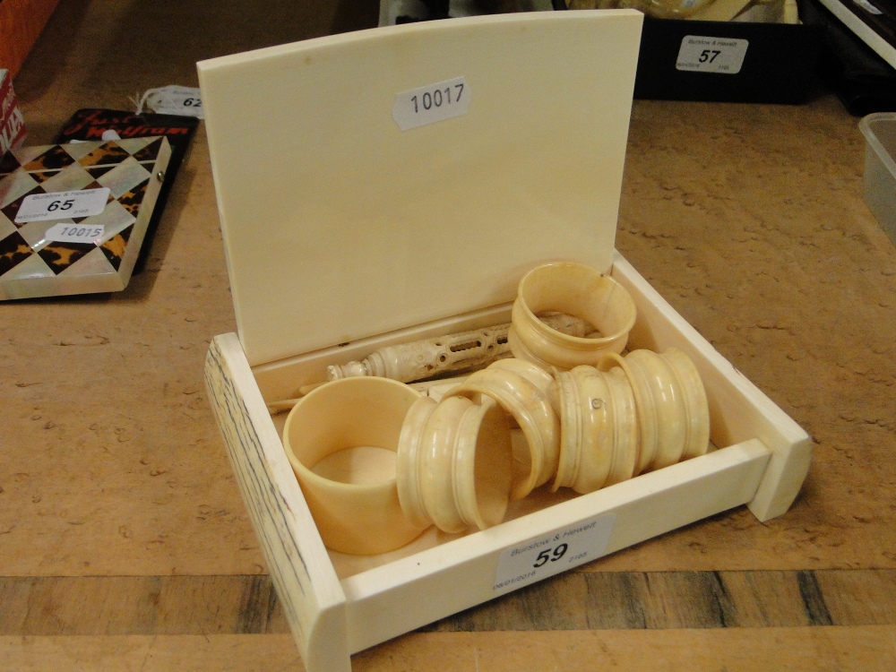 An ivory box, napkin rings, etc.
