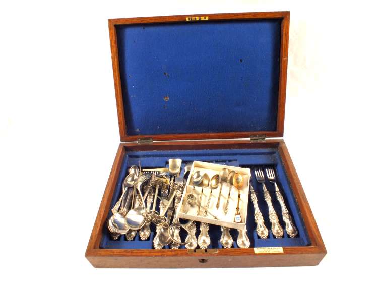 An Oak canteen of Silver plated fish eaters, skewer and knife rests plus other cutlery