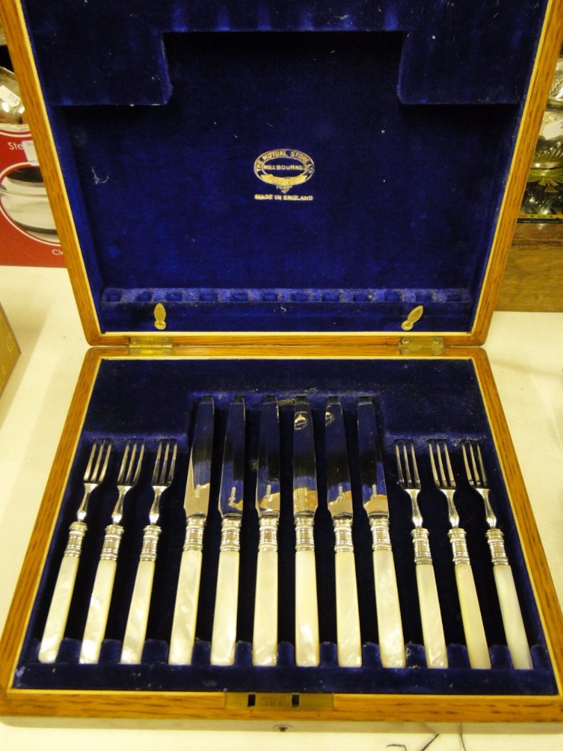 An oak cased canteen of mother of pearl handled cutlery for 6 people.