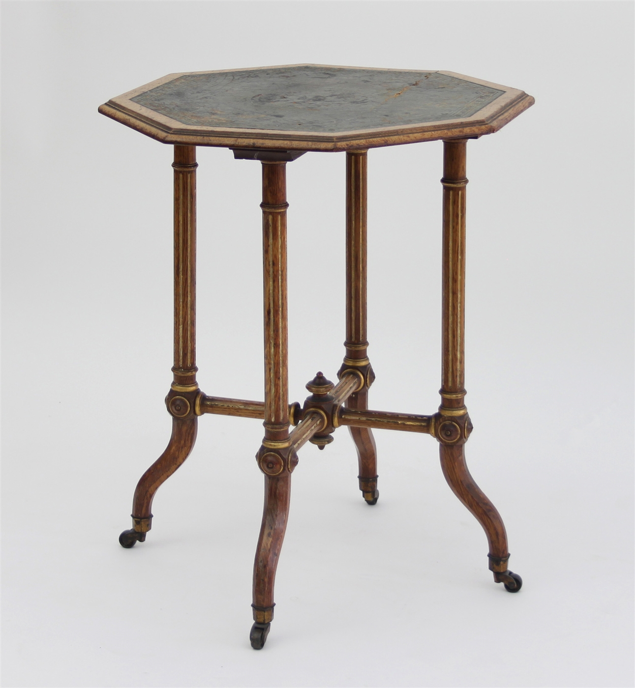with reeded, turned and fluted legs highlighted in gilt, united by an X stretcher, the top inset with green tooled leather
