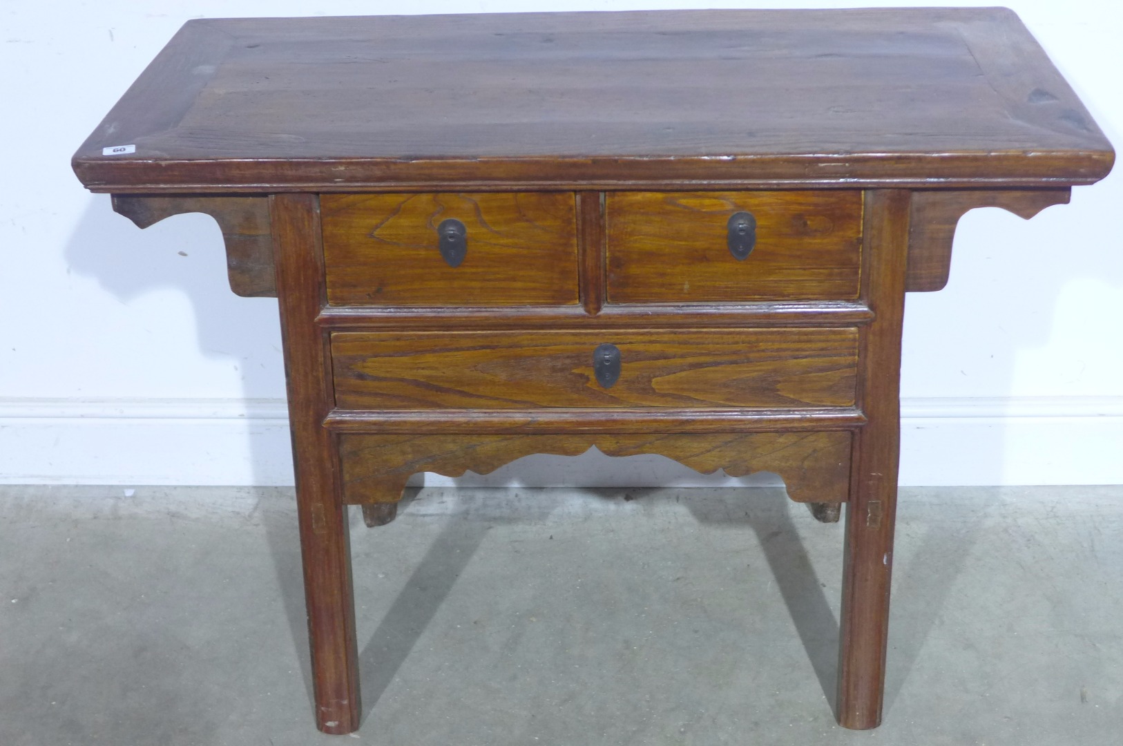 An Oriental hardwood side table with two small and one long drawer, carved apron on splayed square tapering legs