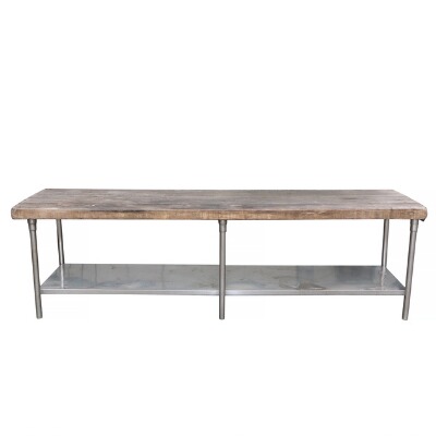 An outdoor kitchen table with wooden table top and stainless steel frame