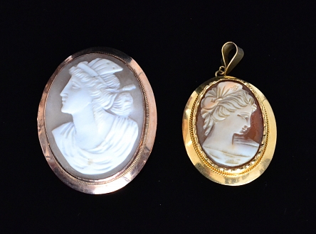 An oval cameo brooch within a 9ct rose gold mount, together with a similar 9ct later example. (2)