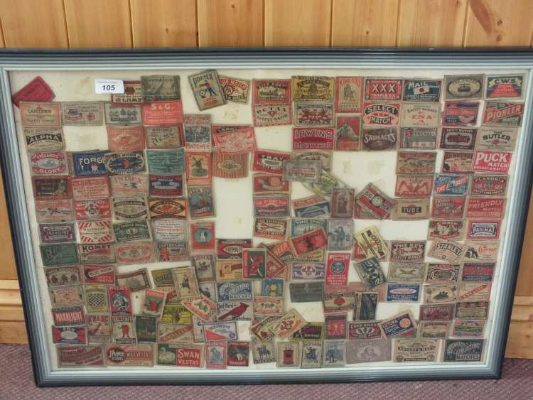 An oval gilt mirror, framed Matchbox labels and three early newspapers
