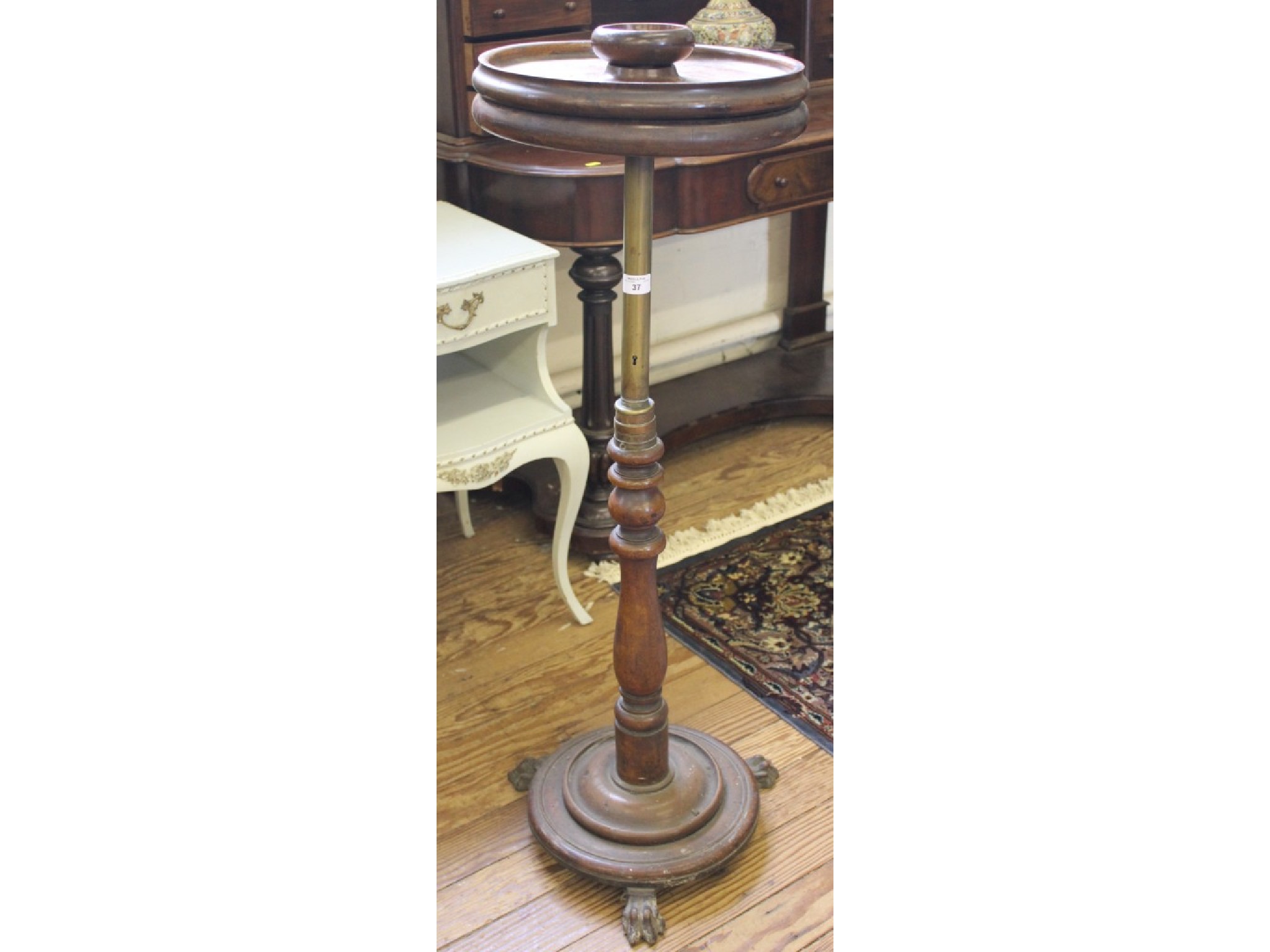 the moulded circular top in two parts with bieze lined cup to the centre over a brass locking shaft above a baluster turned stem on a moulded platform base with lion paw feet