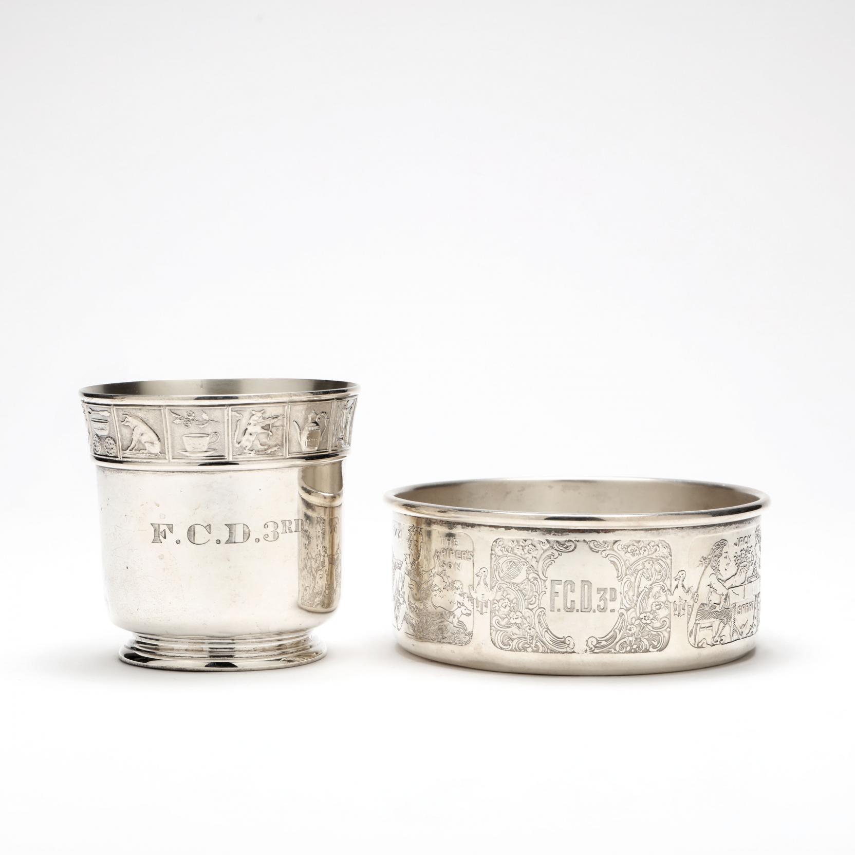 the mug by Gorham and retailed by Bailey, Banks & Biddle Co., pattern A112, engraved "From Your Godfather / J. A. Cauldwell / May 30, 1917" to the underside, monogrammed "F. C. D. 3rd" to side, applied border to rim featuring pictorial vignettes (3 1