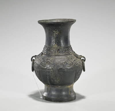 Antique Chinese bronze vase; of globular form, with loop handles pending rings; the body exhibiting archaistic bird designs on a diaper patterned ground; 19th Century; H: 10" (approx.)