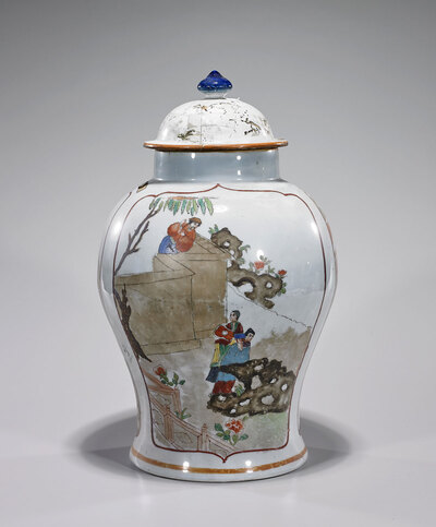 Antique Chinese enameled porcelain covered baluster jar; showing foliate-form panels of figures within architectural settings; 18th Century; Provenance: Collection of Gabriella "Kay" Robertson of Loewi-Robertson Inc.; H: 20" (approx.)
