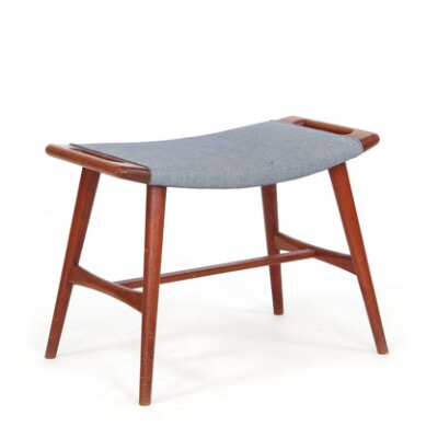 A teak music Stool, seat upholstered with original blue and white fleckered fabric.