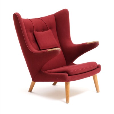 Easy chair with oak legs and nails, recently upholstered with wine red wool.