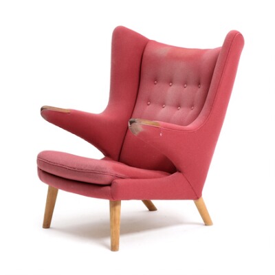 Easy chair with oak legs and teak nails, upholstered with reddish wool