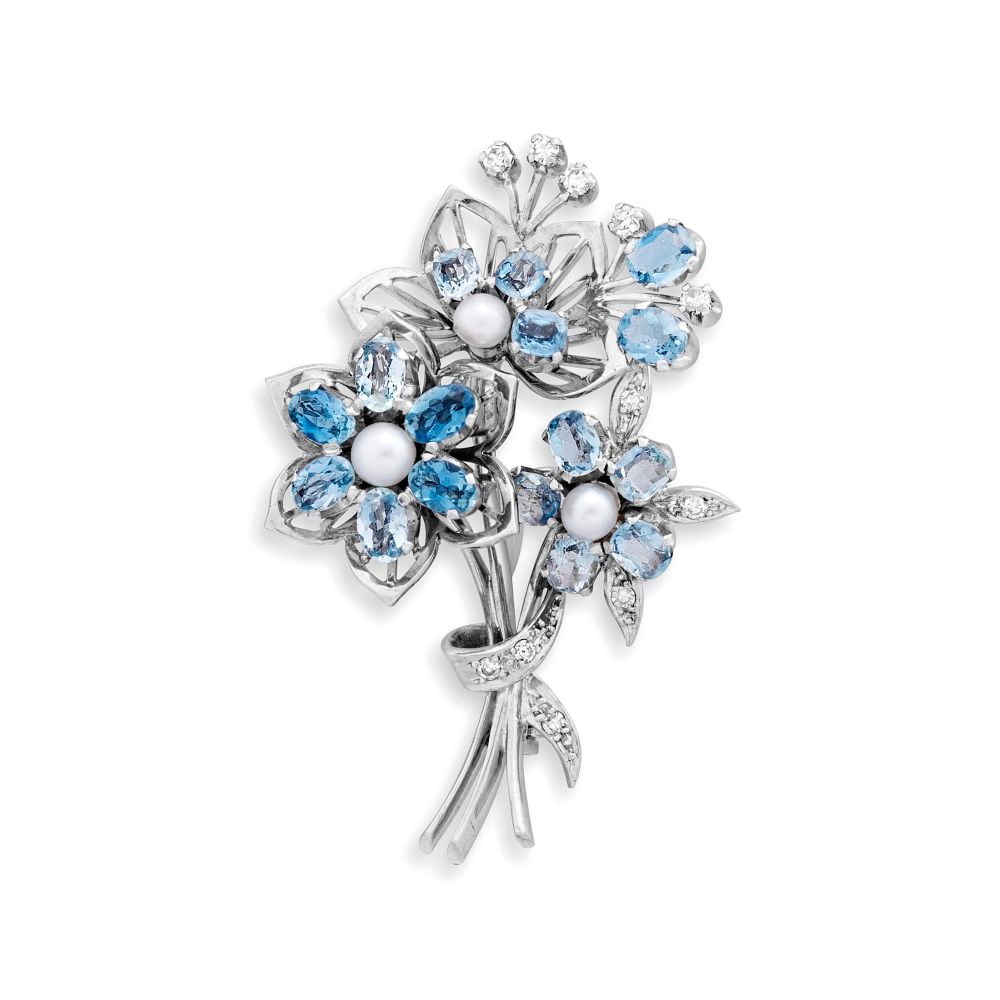 designed as a a spray of three blooms, each flowerhead claw-set with aquamarines centred by a pearl, the foliage and ribbons claw-set with eight-cut diamonds, hallmarks for Birmingham, maker's initials C&F, length approximately 45mm