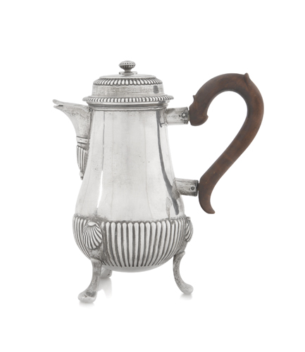 CAFFETTIERA IN ARGENTO, META' XVIII SECOLO, PROBABILMENTE ITALIA CENTRALE, piriforme in parte baccellata su tre piedi, coperchio incernierato lateralmente e manico in legno; difetti. Peso lordo g 530
