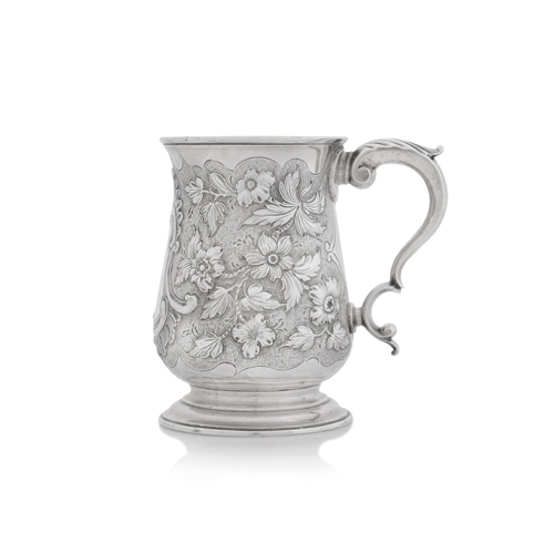 MUG GIORGIO III IN ARGENTO, LONDRA, 1777, ARGENTIERE J.SCHOFIELD, sbalzato con decoro floreale e manico a voluta. g 340