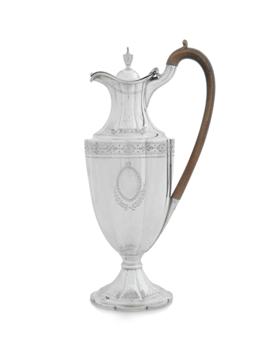 VERSATOIO GIORGIO III IN ARGENTO, LONDRA, 1793, ARGENTIERE C.ALDRIDGE, piriforme costolato con decori floreali incisi e manico in legno a voluta. Peso lordo g 740