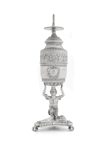 RARA STOPPINIERA WILLIAM III IN ARGENTO, LONDRA, 1697, ARGENTIERE A.NELME, a coppa baccellata e godronata, sbalzi a volute e stemma araldico, sostegno a figura di moretto inginocchiato su tripode con piedi ferini. g 920