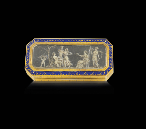 TABACCHIERA IN ARGENTO DORATO DECORATA A SMALTI CON MINIATURA, XIX SECOLO, ottagonale con decoro mitologico en grisaille entro riserva; fessura sul vetro del coperchio e usure. g 96