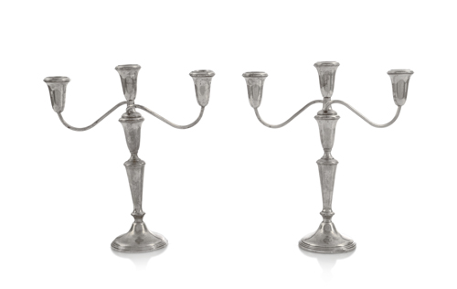 COPPIA DI CANDELABRI IN ARGENTO, USA, XX SECOLO, a tre fiamme con bracci a volute, fusto a balaustro su base circolare; zavorrati e lievi ammaccature. Peso lordo g 1880