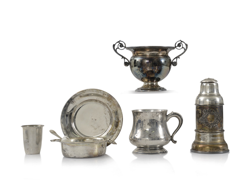 LOTTO DI DIVERSI OGGETTI IN ARGENTO, XX SECOLO, composto da un mug, una coppa due manici, un thermos e un set per bambino composto da ciotola, piatto, bicchiere e cucchiaino. g 770 pesabile