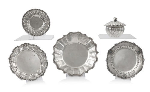 TRE DIVERSI PIATTI SAGOMATI E UNA CIOTOLA CON COPERCHIO E PIATTO IN ARGENTO, XX SECOLO. g 1730, diam. massimo 28,5 cm