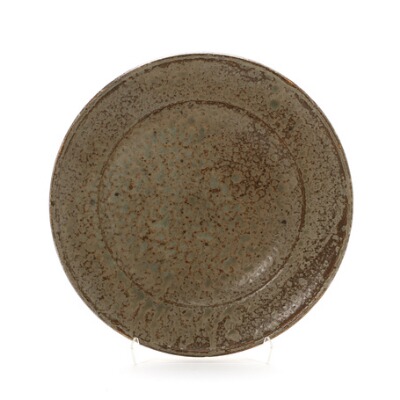 Decorated with greyish brown glaze with some blue elements. Diam. 33,5 cm.