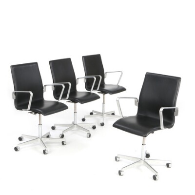 Set of four swivel armchairs with castors and base of aluminium. Upholstered with black leather. (4)