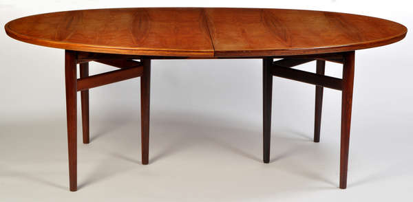 comprising a dining table with oval top, raised on turned tapering legs joined by rectangular stretchers, two leaves, 198 (78in) unextended; a sideboard with tambour front sliding doors enclosing shelves and drawers, raised on turned tapering legs, 2