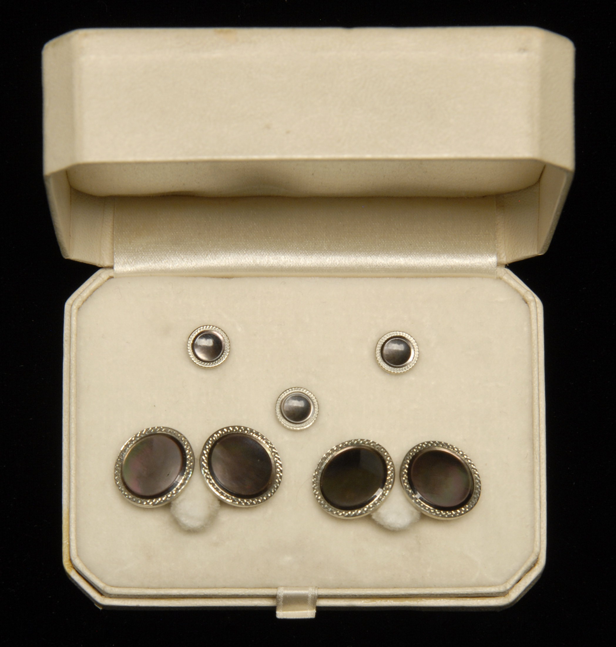 A pair of cufflinks and three shirt studs. In a case for retailer Frederick Loeser & Co., Brooklyn, New York. Lengths of cufflinks 1."