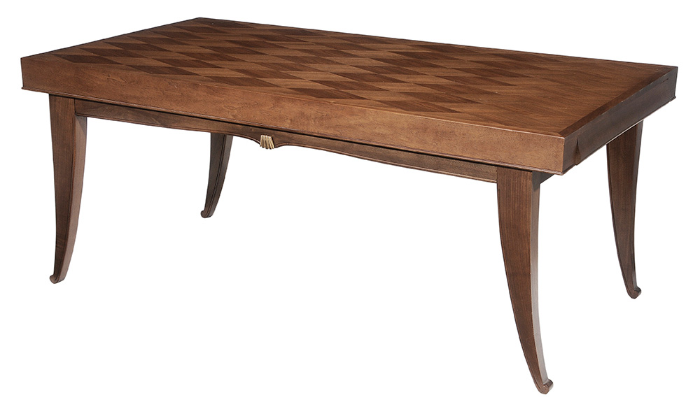 each side skirt set with a single drawer, long skirts centered by gilt applique, saber legs, parquetry top