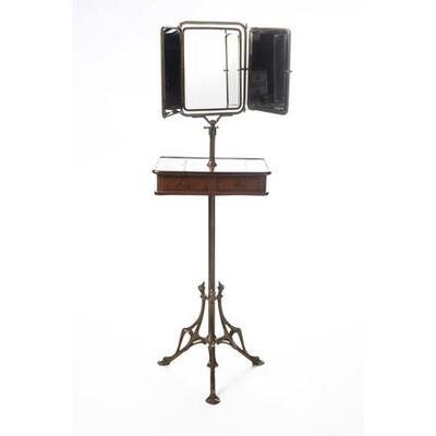 Art Nouveau washbasin cabinet, tripod foot in brass topped with a wooden part with two drawers and brass cladding, tripartite mirror.