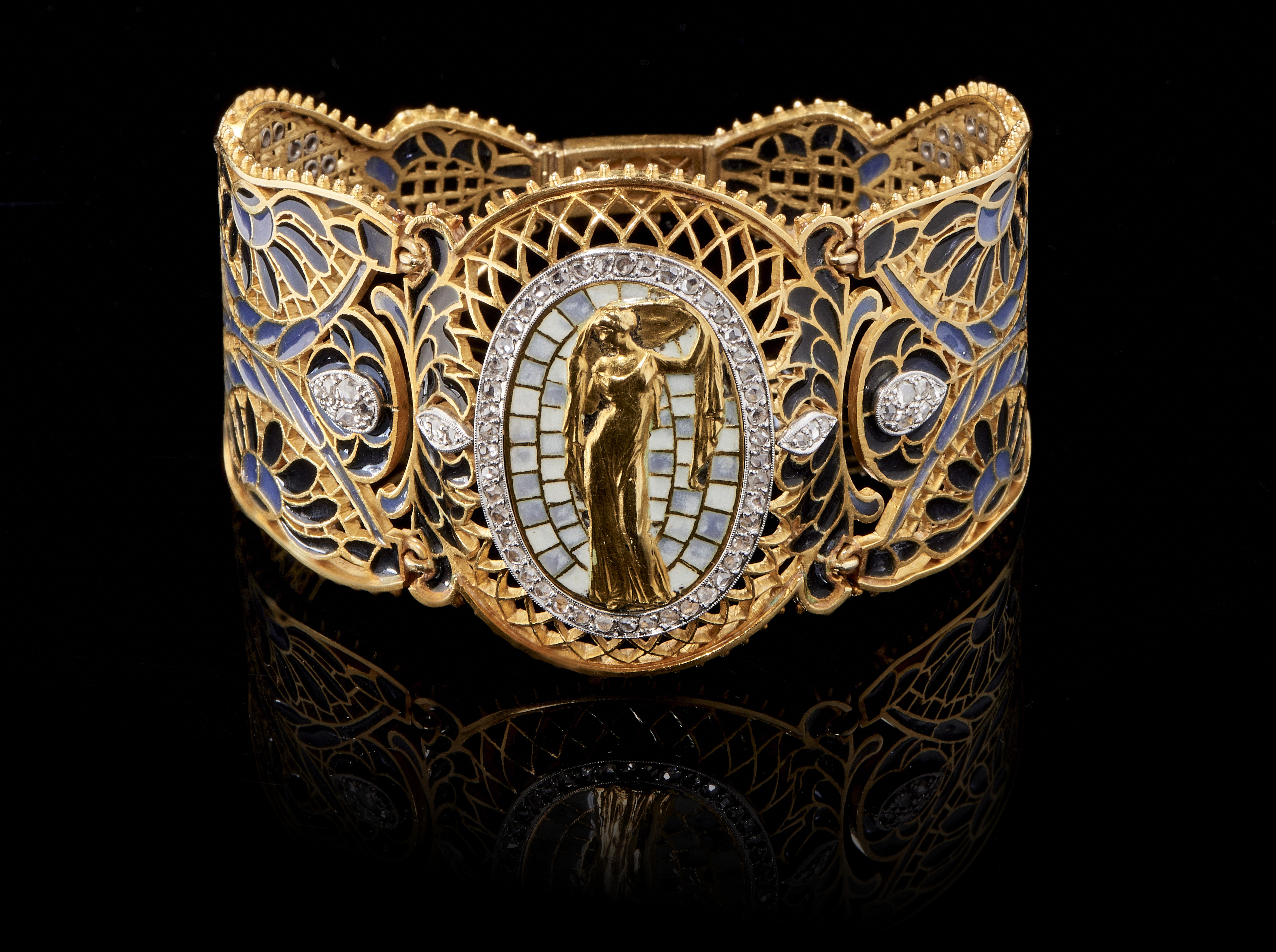 Articulated Art Nouveau cuff bracelet, enamelled plique-à-jour and centered