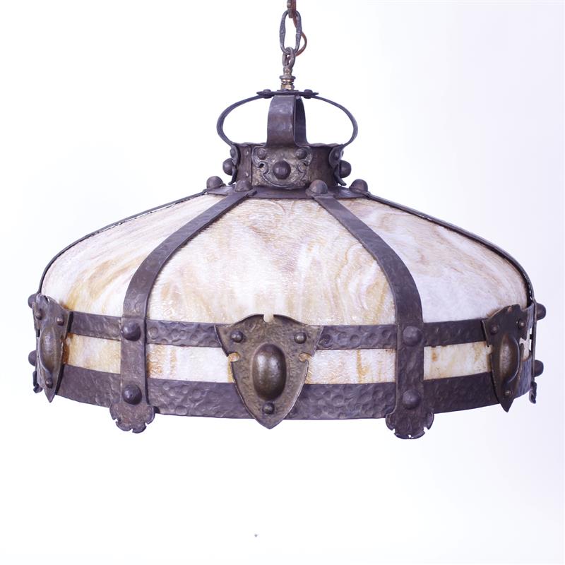 Arts & Crafts hammered iron & caramel slag glass hanging light fixture