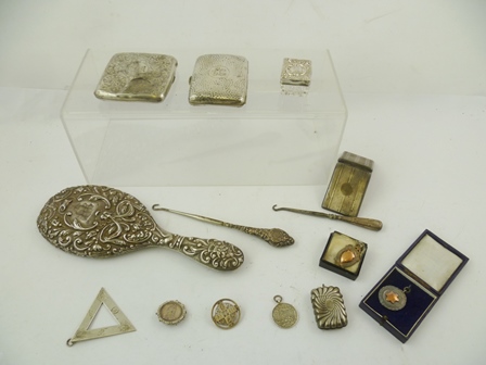 ASSORTED ITEMS OF HALLMARKED SILVER includes; a vesta, cigarette cases, Masonic pendant, fobs, embossed mounted vanity mirror etc., weighable silver 250g