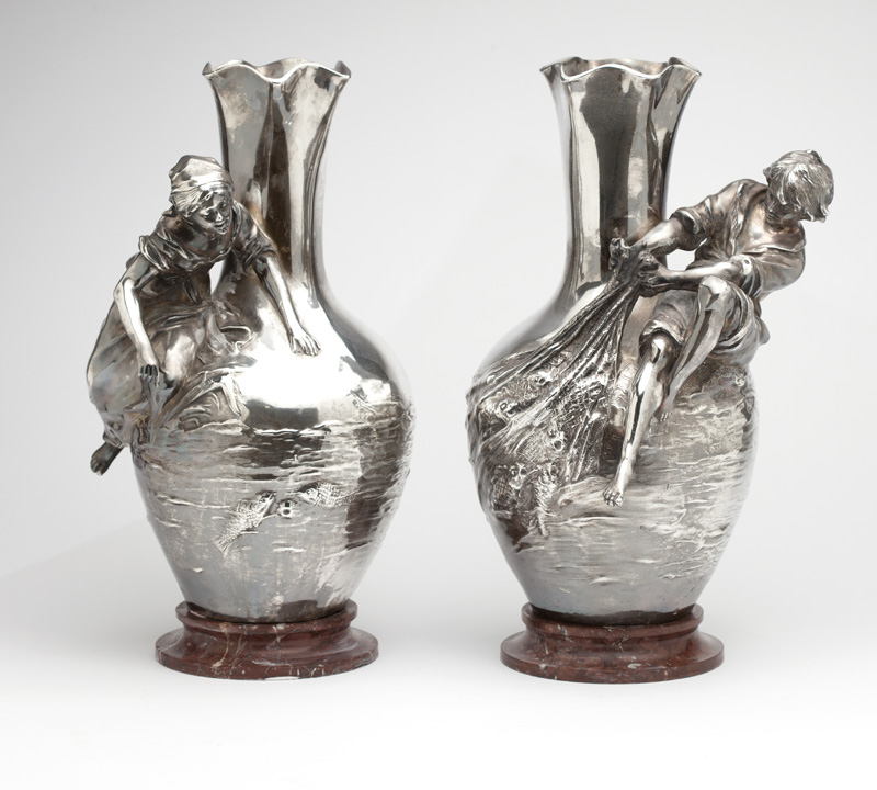 Each signed in the mold ''Aug Moreau'', a complementary pair of silver-plated figural vases, Late 19th century