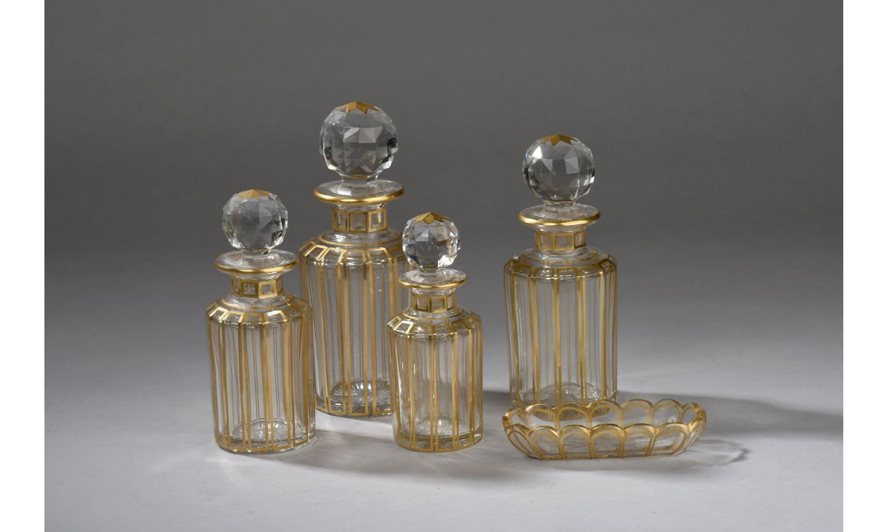 BACCARAT. Toiletries cut crystal embellished with gold. It includes a ring sizer and four cylindrical vial stopper.