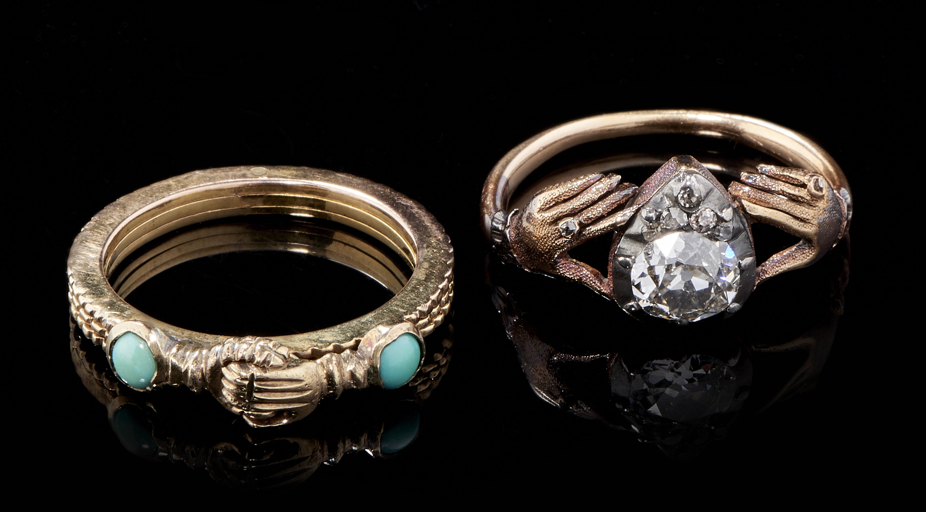 Or 585 et argent, doigt 57-17, 4 g. On joint une bague de foi formée de trois anneaux s'ouvrant sur un cœur et sertis de deux turquoises en cabochon, or bas titre, doigt 58-18.