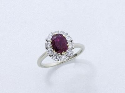 Bague en or gris 750 millièmes, ornée d'un rubis ovale facetté en serti griffe dans un entourage de diamants brillantés. Poids du rubis: 1.50 ct env. (égrisures) Poids des diamants: 0.70 ct env l'ensemble. Poids brut: 4.20 g. TDD: 56.