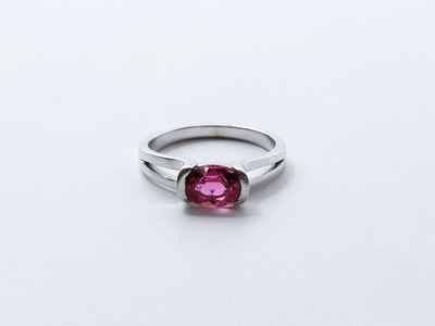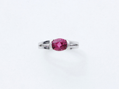 Bague en or gris 750 millièmes, ornée d'une tourmaline rose ovale facettée en demi serti clos. (égrisures) Poids brut: 3.60 g. TDD: 53.5.