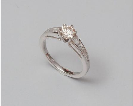 Bague solitaire en or gris, ornée d'un brillant pesant 0,75 carat épaulé par deux lignes de diamants taille baguette