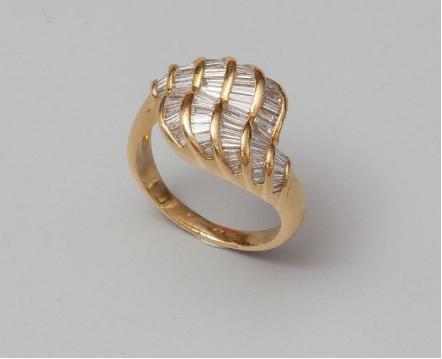 Bague " toi et moi " en or jaune, 750 MM, dessinant deux motifs recouverts de diamants taille tappers
