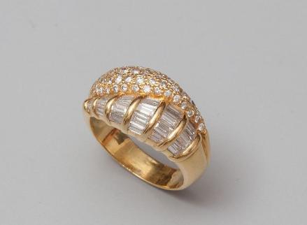 Bague " toi et moi " en or jaune, 750 MM, dessinant un motif recouvert de brillants et un motif recouvert de diamants taille tap