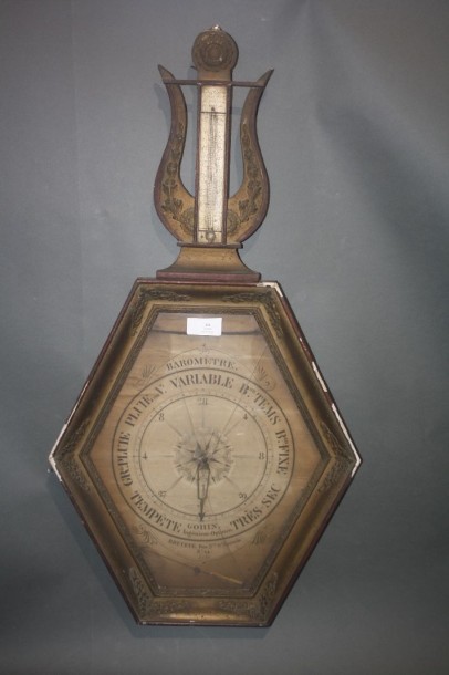 Barometer thermometer in wood and gilded stucco, octagonal frame decorated with palmettes, pediment in the form of lyre. Patented model rue St Eustache, n ° 24.