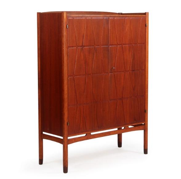 Front with two doors and "shoes" of teak, decorated with geometrical motif in relief, Inside with adjustable shelves and trays