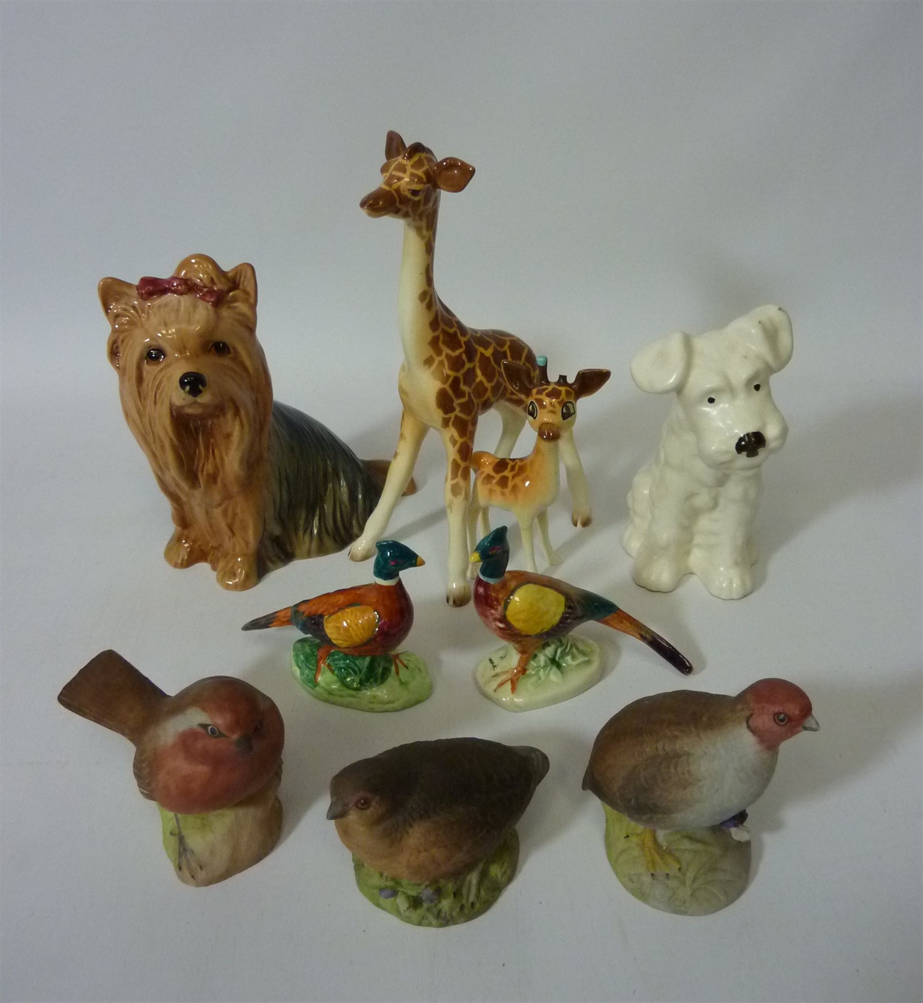 Beswick giraffes, Sylvac Yorkshire and Sealyham terriers, three Aynsley birds and two others