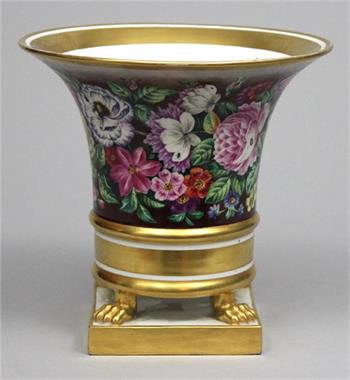 Glockenform mit vier Klauenfüssen auf quadratischem Sockel. Umlaufender bunt gemalter Blütenfries mit Käfern. Goldränder und -staffage berieben, Sockelkante best., Lippe mit Haarriss. Boden mit blauer Bienenkorbmarke wohl Wien, 19. Jh. H. 19,5 cm