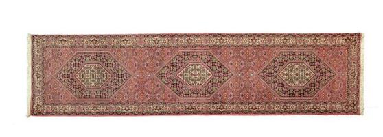 The medallions on a red ground with geometric designs throughout, set within multiple borders. 9'8"l. 2'6"w.