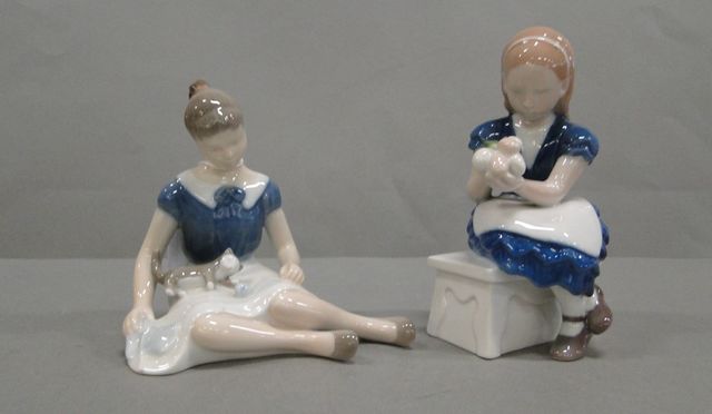 Bing & Gröndahl 2st figuriner, flicka med katt resp. flicka med blombukett, 1:a sortering