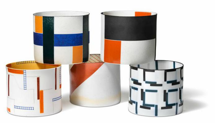 Five small, cylindrical thin porcelain bowls. Decorated with geometric shaped patterns in blue, black, red, orange and green glaze. Signed Bodil Manz. Unique. H. 7,5. - 8 cm. Diam. circa 9. - 9,5 cm. (5)