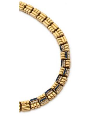 In 18k yellow gold (750) formed of an articulated ribbon carved patterns perpendicular godrons in his front nine of them, each decorated with a calibrated sapphires strip underlined with brilliant-cut diamonds Signed Boucheron A133-109 Long .: 42 c