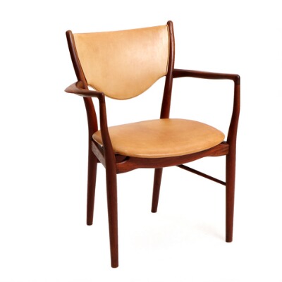 A teak armchair, seat and back upholstered with light brown leather.